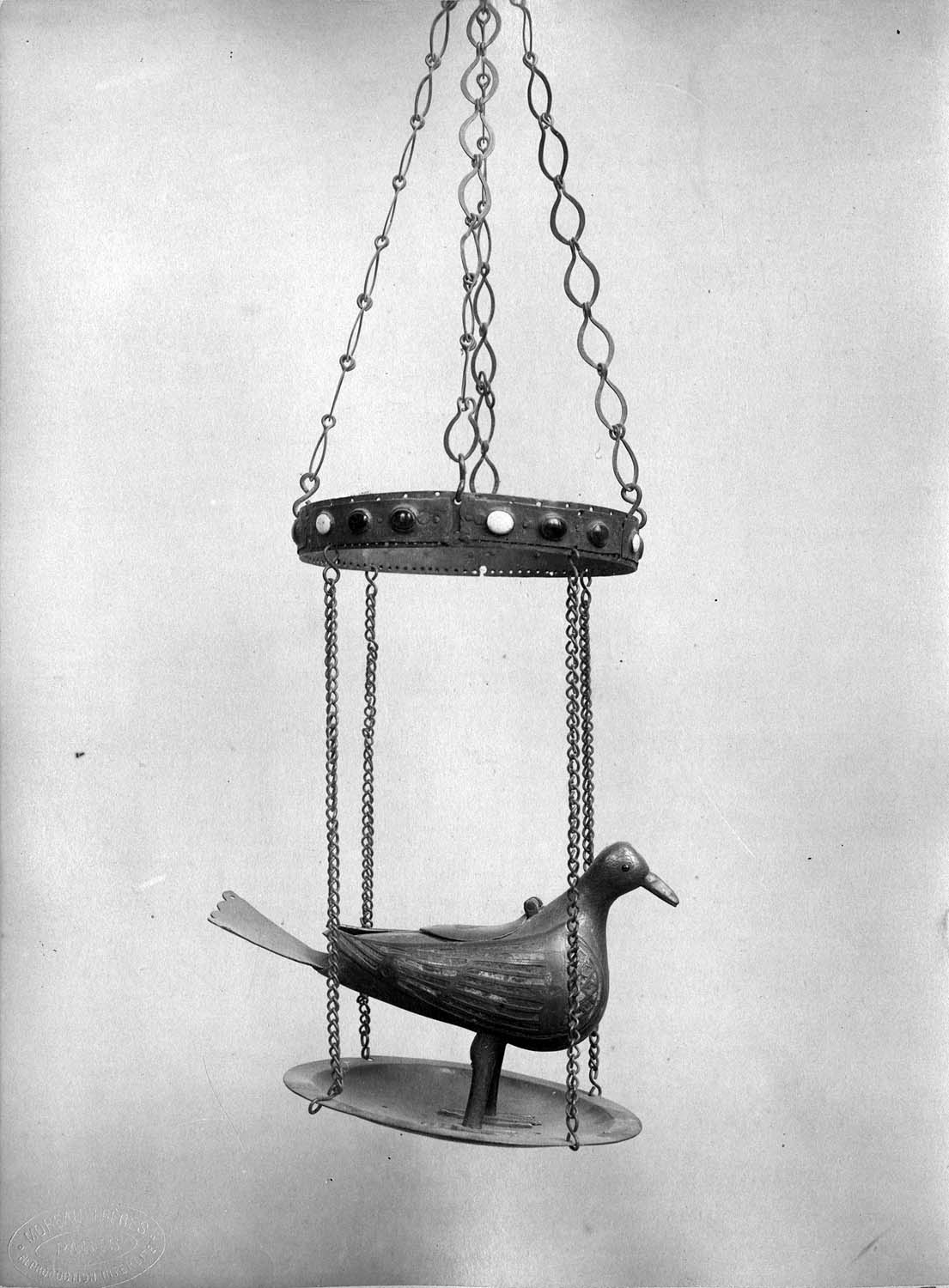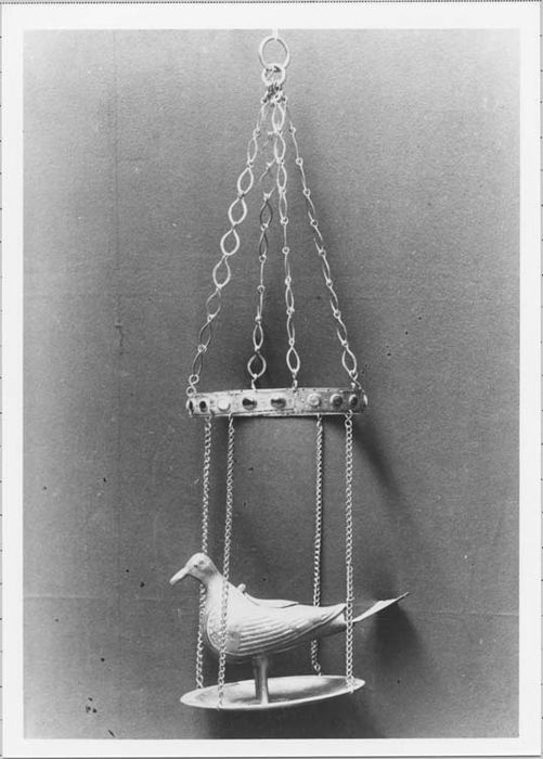 Avant classement : en 1860 3 chaînettes reliaient le plateau à la couronne et une tour était conservée ; la restauration qui suivit à Paris supprima la tour, ajouta une 4e chaîne et refixa la queue de la colombe à l'envers
