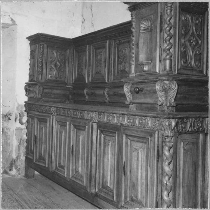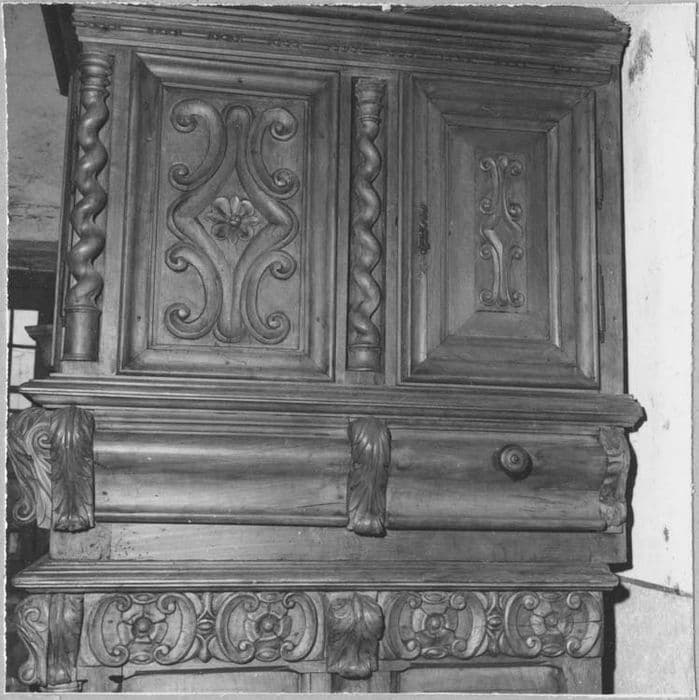 Avant classement : il manque des colonnettes ; après classement : oeuvre restaurée et complétée en 1988 par les établissements Jean Férignac (fabrication de portes et tiroirs)