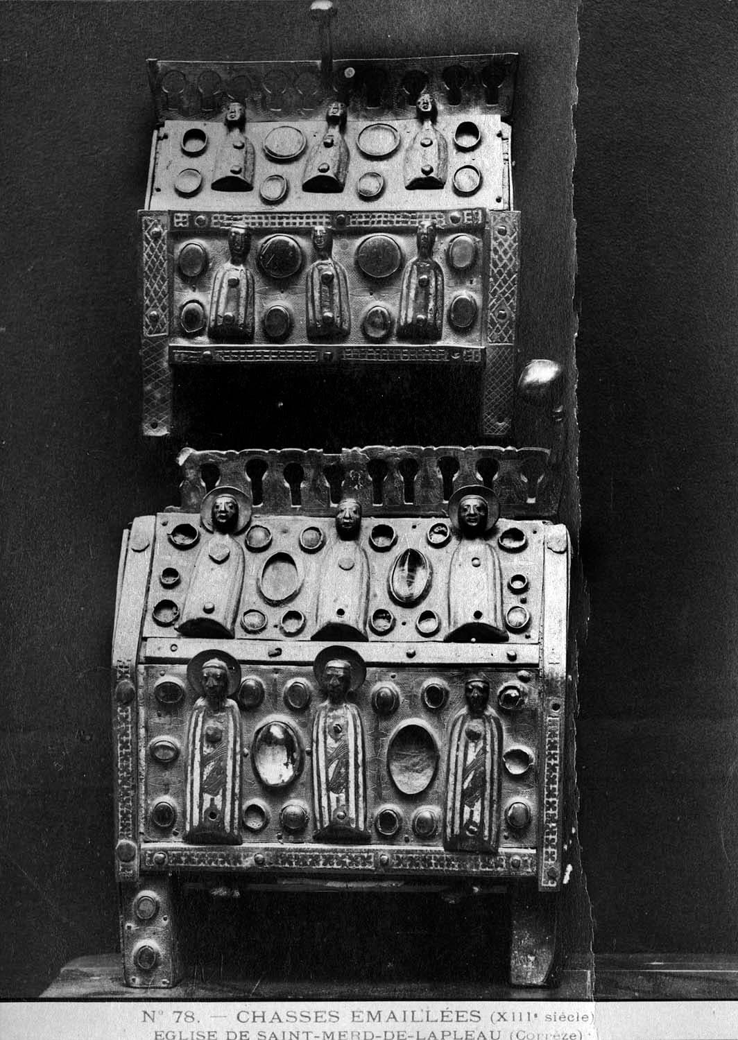 Châsse en forme de maison exhaussée sur quatre pieds ; divers parements de cuivre, certains émaillés, ont été fixés sur l'âme de bois ; à l'avers chacun des registres comporte 3 figures d'applique en cuivre émaillé clouées ; les plaques de revêtement sont percées d'alvéoles rondes ou ovales dont les bords relevés servent de bâtes à 32 cabochons (verre ou cristal de roche), le pied gauche en comporte 2 supplémentaires ; des bandeaux émaillés encadrent les plaques ; au revers sont une plaque émaillée pour le rampant, deux pour les montants et une ornant une porte dotée de charnières et serrure à la caisse ; deux plaques émaillées pentagonales décorent les pignons ; la crête est ajourée et s'agrémente de 3 pommes