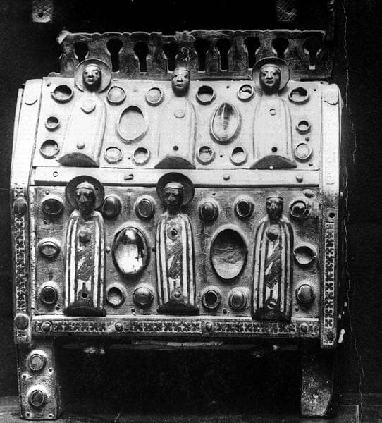 Les 6 figures de saints sont clouées à l'avers et sont encadrées de cabochons, le fond mate est gravé de quatre-feuilles ; au revers 5 anges à mi-corps sont inscrits dans des médaillons (3 au rampant, 2 à la caisse) entourés de rinceaux ; à chaque pignon une figure d'apôtre prend place sous une arcature ; la crête, gravée de fleurons, est ajourée de motifs en entrée de serrure.