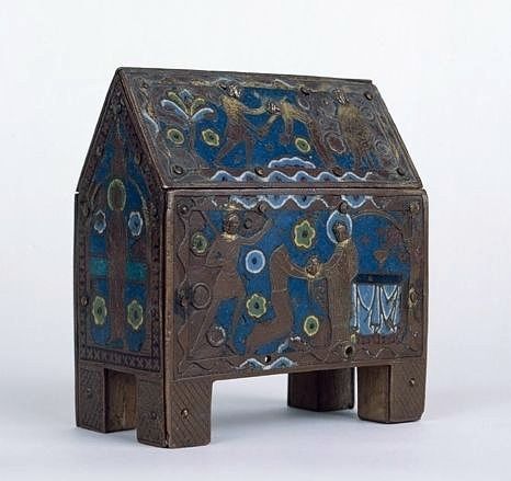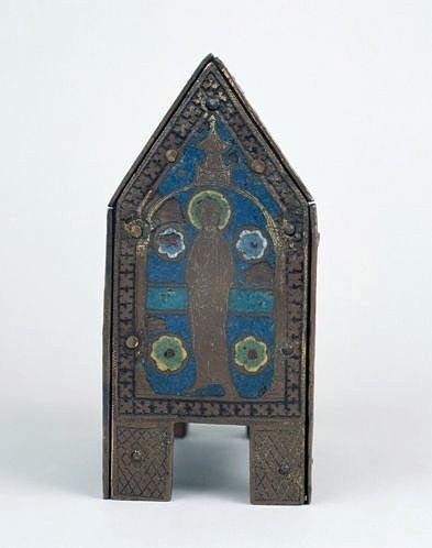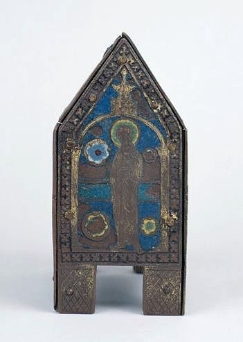Châsse en forme de maison exhaussée sur quatre pieds ; sur l'âme de bois sont clouées des plaques de cuivre émaillé à l'avers et aux pignons, nues au revers ; un regard rectangulaire vitré est aménagé au rampant du revers ; les têtes des figures de l'avers sont rapportées