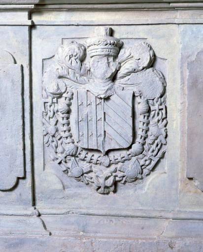 sur la façade du tombeau figurent à droite : d'or à trois pals de gueules chargés chacun de trois étoiles d'argent qui est Meilhards, à gauche : écu parti d'or à trois pals de gueules chargés chacun de trois étoiles d'argent (qui est Meilhards), et d'or à trois bandes de sinople qui est Salagnac ; autour des écus sont figurés le collier de l'ordre de saint Michel et celui des chevaliers des ordres du roi