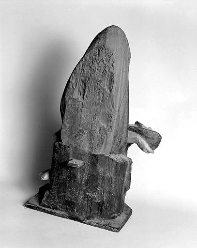 Revers plat non travaillé peint ; fixation pour cadenas prévue au revers ; la statue est fixée à un socle en bois moderne