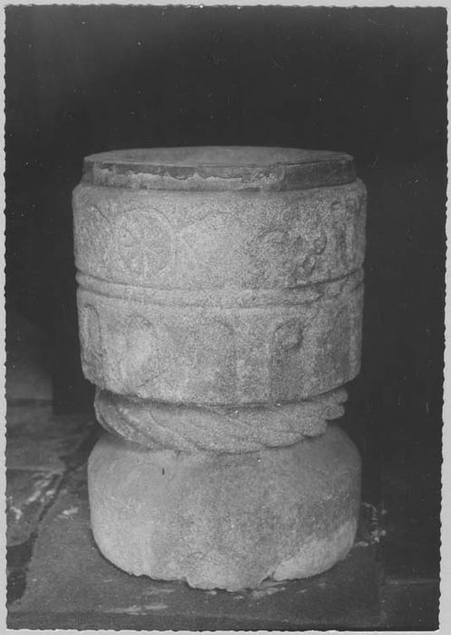 Bénitier de section octogonale comportant un rétrécissement central ; la partie supérieure comporte une cavité circulaire