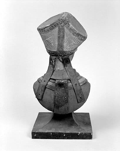 La tête en calcaire est fixée au buste en bois au moyen de deux plaques métalliques rivetées dans le bois et vissées dans la pierre ; le buste est enfoncé à mortaise sur un piédouche moderne