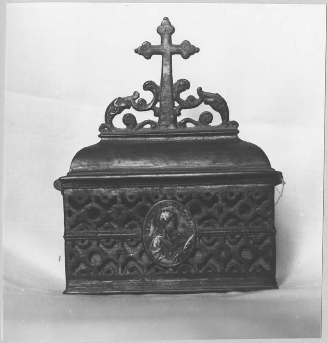 Avant classement : le coffret pourrait être un élément d'un reliquaire pédiculé ; il manque la vitre fermant le regard de l'avers du reliquaire