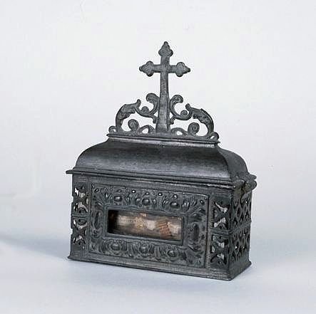 Le corps du coffret rectangulaire se compose de quatre plaques d'étain ajourées soudées au fond constitué d'une autre plaque non ajourée ; sur l'avers le coffret présente un regard rectangulaire autrefois vitré ; au revers est rapporté un médaillon ovale ; le revers de la plaque du fond porte quatre traces de soudure formant un carré (fixation d'un pied ?) ; les sommets des petits côtés sont dotés de charnières qui servent à la fixation du couvercle ; rectangulaire également, il est surmonté d'un motif fondu et ajouré, rapporté ; à l'intérieur du coffret est placé un réceptacle rectangulaire en fer étamé comportant un regard vitré