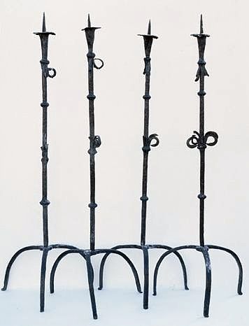 Les porte-cierges comportent des bobèches qui débordent les binets et reposent sur une base tripode isocèle