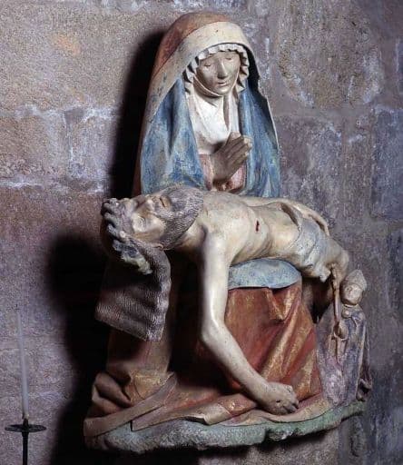 groupe sculpté (petite nature) : Vierge de Pitié avec un évêque en donateur