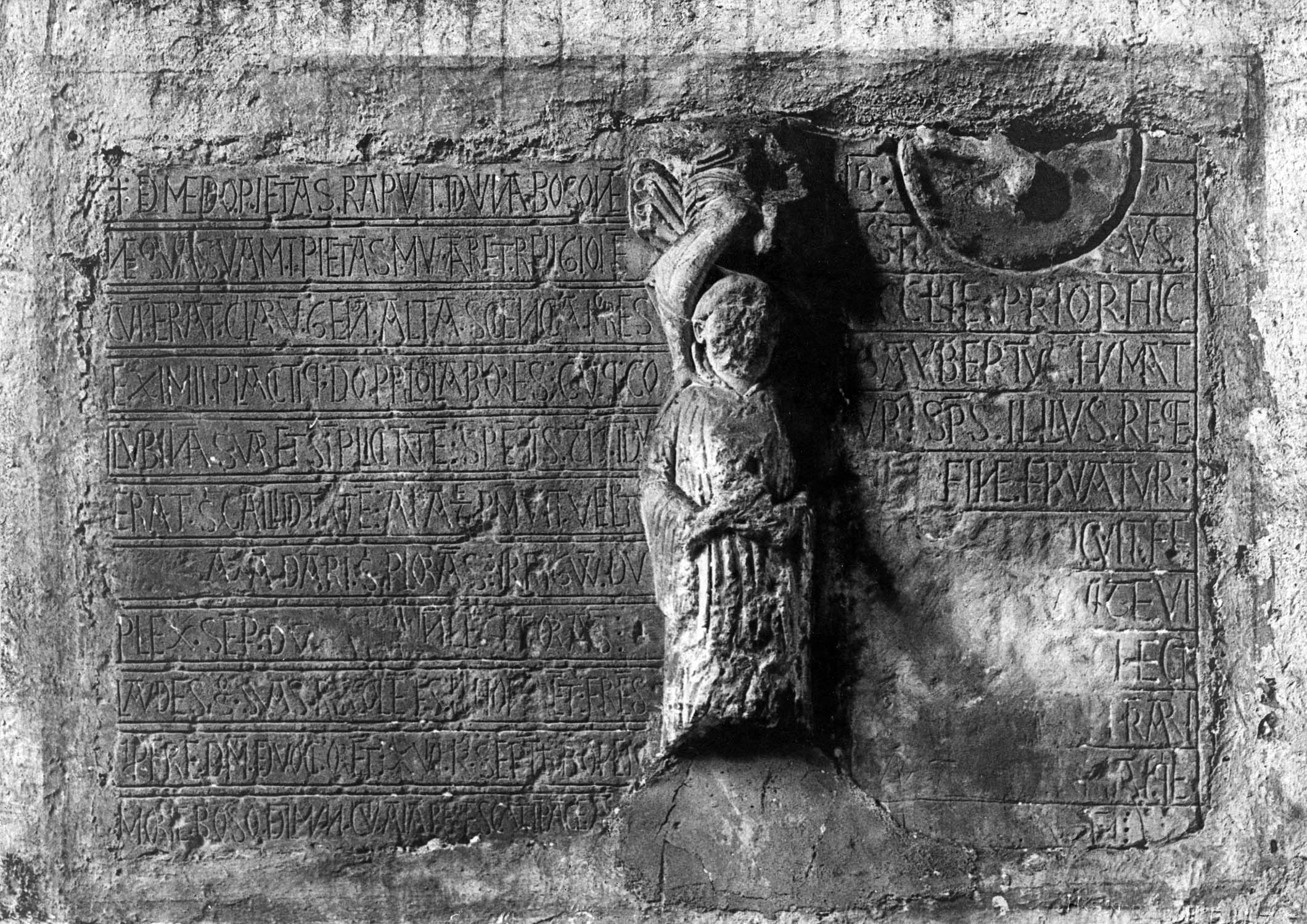inscription latine sur 11 lignes, cadre et lignes préalablement tracés (d'après sources) : + DE MEDIO. PIETAS. RAPVIT. DIVINA. BOSONEM/NE QVIA. SVAM. IMPIETAS MVTARET. RELIGIONEM/CVIVS. ERAT. CLARVM. GENVS. ALTA. SCIENCIA. MORES/EXIMII. PLACITIQVE DEO. POPVLOQVE LABORES : CVMQVE CO/LVMBINAM. SERVARET SIMPLICITATEM : SERPENTIS. TAMEN. INDV/ERAT. SIBI. CALLIDITATEM : A PATRE PROMERVIT. VELVT/AXA. DARI. SIBI. PLORANS : IRRIGVVM. DV/PLEX. SEMPER. DVM. NON LEGIT ORANS : /LAVDES. ERGO. SVAS. RECOLENTES. N[OMEN] HONORENT : FRATRES/ET PRO. FRATRE. DEVM. DEVOCIVS. ORENT : XVII. KALENDAS SEPTEMBRIS OB[IIT] BONE ME/MORIE. BOSO. DEI MVN[ERE]. CVIVS ANIMA. REQVIESCAT IN PACE. AMEN