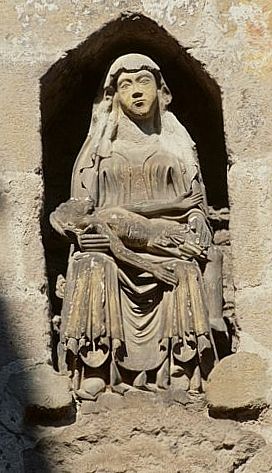 La Vierge assise est coiffée d'un voile, elle est vêtue d'une robe et d'un manteau à nombreux plis ; le Christ de petites dimensions est vêtu du perizonium ; le bras droit de la Vierge soutient sa tête, tandis que la main gauche repose sur sa cuisse.