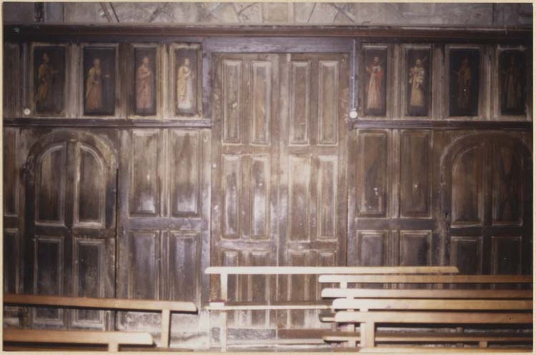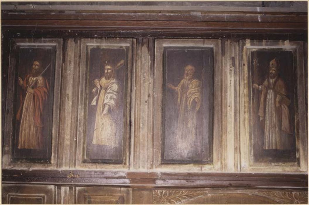 De gauche à droite les panneaux représentent : un saint évêque barbu coiffé de la mitre, tenant la crosse dans la main gauche, vêtu d'une tunique jaune recouverte d'une chape orange à bordure rouge ; un apôtre (saint André ou saint Philippe) : âgé il est barbu, ses cheveux sont blancs, il porte une tunique orange drapée d'un manteau blanc, il tient une croix dans la main gauche, dans l'autre un livre ; saint Barthélémy : barbu, vêtu d'une tunique rose et d'un manteau rouge, il tient le couteau de son supplice dans la main droite ; saint Jean l'Evangéliste : figuré en jeune homme vêtu d'une tunique blanche et d'un manteau jaune, il tient une coupe ; saint Paul : barbu, vêtu d'une tunique rose drapée d'un manteau rouge, il lève la main droite et tient dans l'autre main l'épée qu'il fait reposer sur son épaule ; saint Jacques le Mineur ou saint Jude Thaddée : barbu le saint est vêtu d'une tunique jaune drapée d'un manteau blanc, il tient un gourdin dans la main droite et le fait reposer sur son épaule, l'autre main est dirigée vers le sol ; saint Thomas : figuré avec une barbe blanche, il porte une tunique et un manteau blancs, dans la main gauche il tient la lance de son supplice et lève l'autre main ; un saint évêque : barbu il est vêtu d'une tunique blanche et d'une chape jaune rose à bordure pourpre, il tient la crosse dans la main droite et retient sa chape de l'autre.