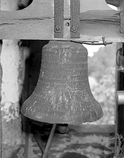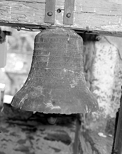 inscription développée sur toute la cloche (en grands caractères romains) en 11 lignes : SIT NOMEN DOMINI BENDI MUT FRUCTUS TERRAE / DARE ET CONSERVARE DIGNERIS TE ROGAMUS AUDI / NOS STI MARTINE IOANNES BAPTISTA ANDREA / FABIANE SEBASTIANE COSMA DAMIANE / GERVASIS PROTHASI GABINNE QUIRINE / QUINIDE MARTINNA MARI RD. DEGONDIS / ORATE PRO NOBIS IL A ETE FAIT DEUX CLOCHES / A BASSIGNAC-LE-BAS 1611 / MAIN R.D.N. ROQUE CURE ET PARIN / AVEC MP MIRAT CURE DE CHANAC / ET MARINES DR DE CHAUVAGNAC (2 mots illisibles) [d'après sources]