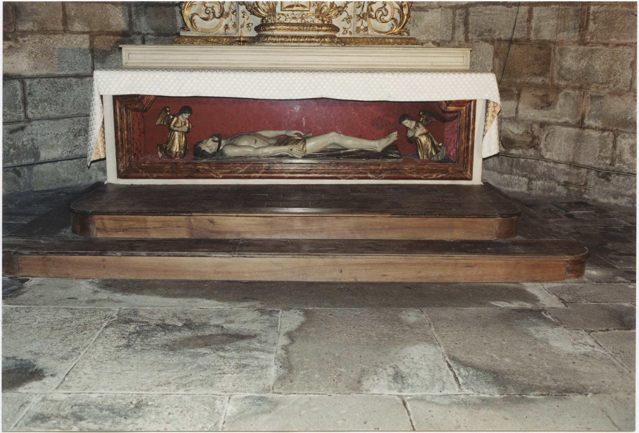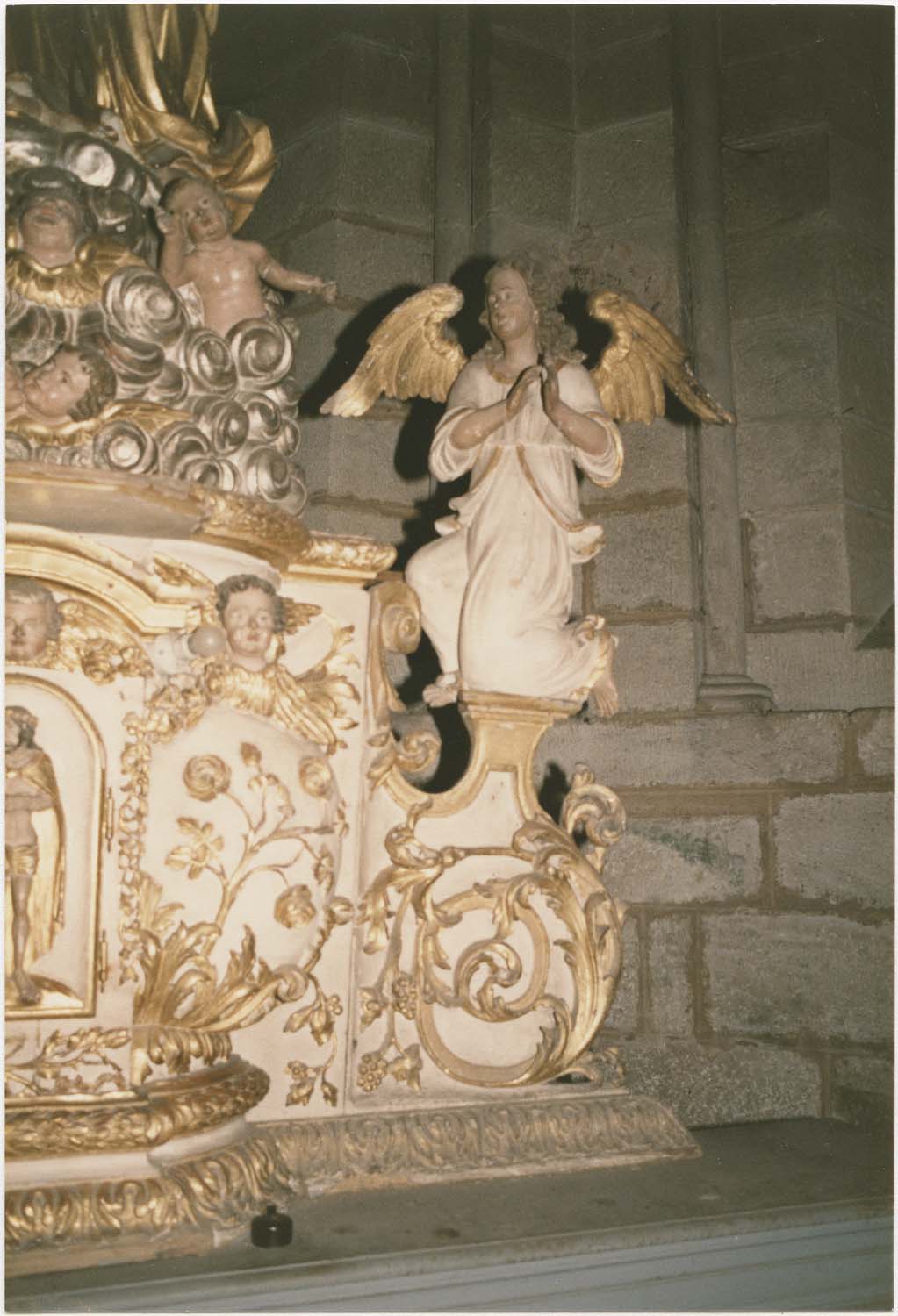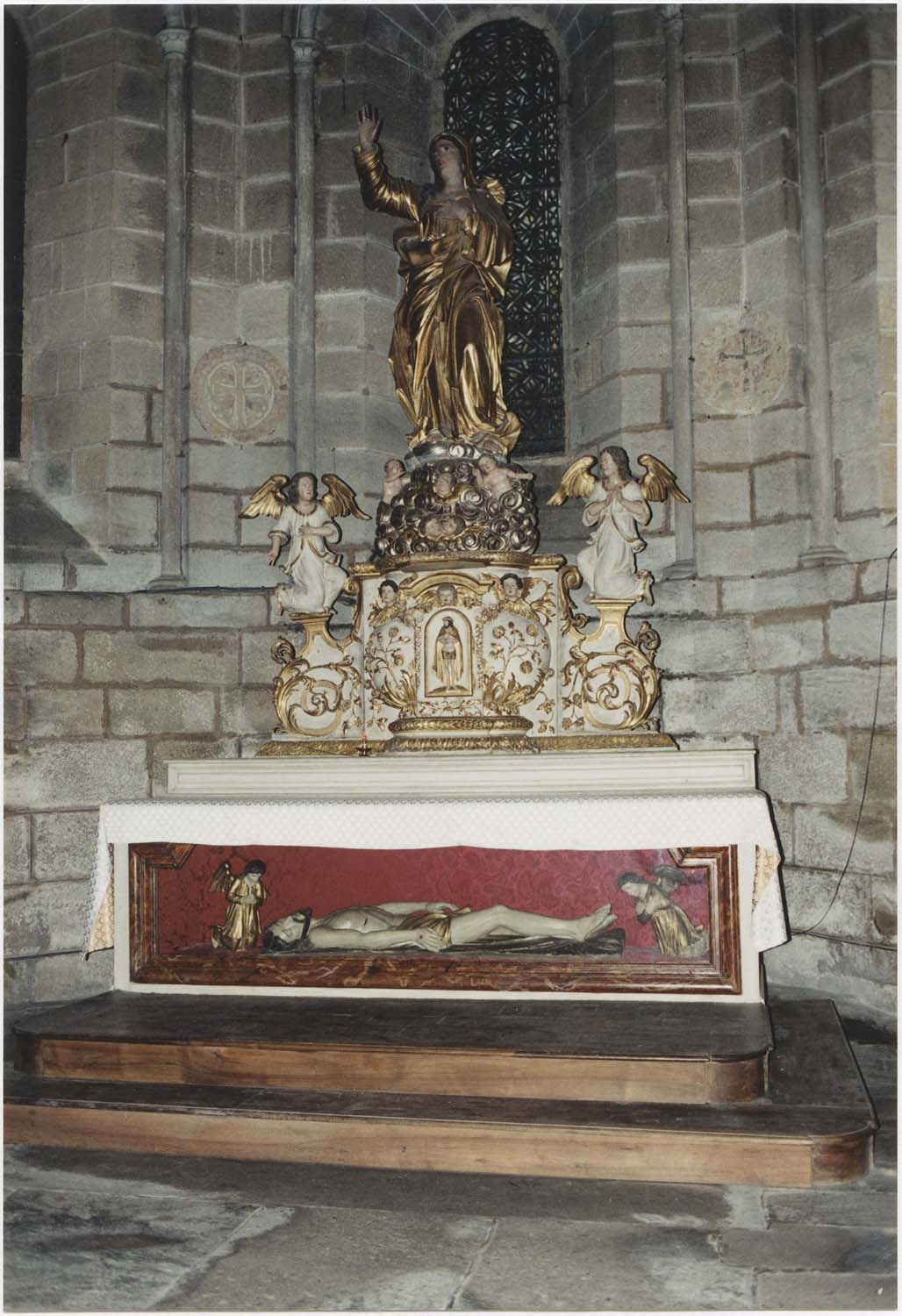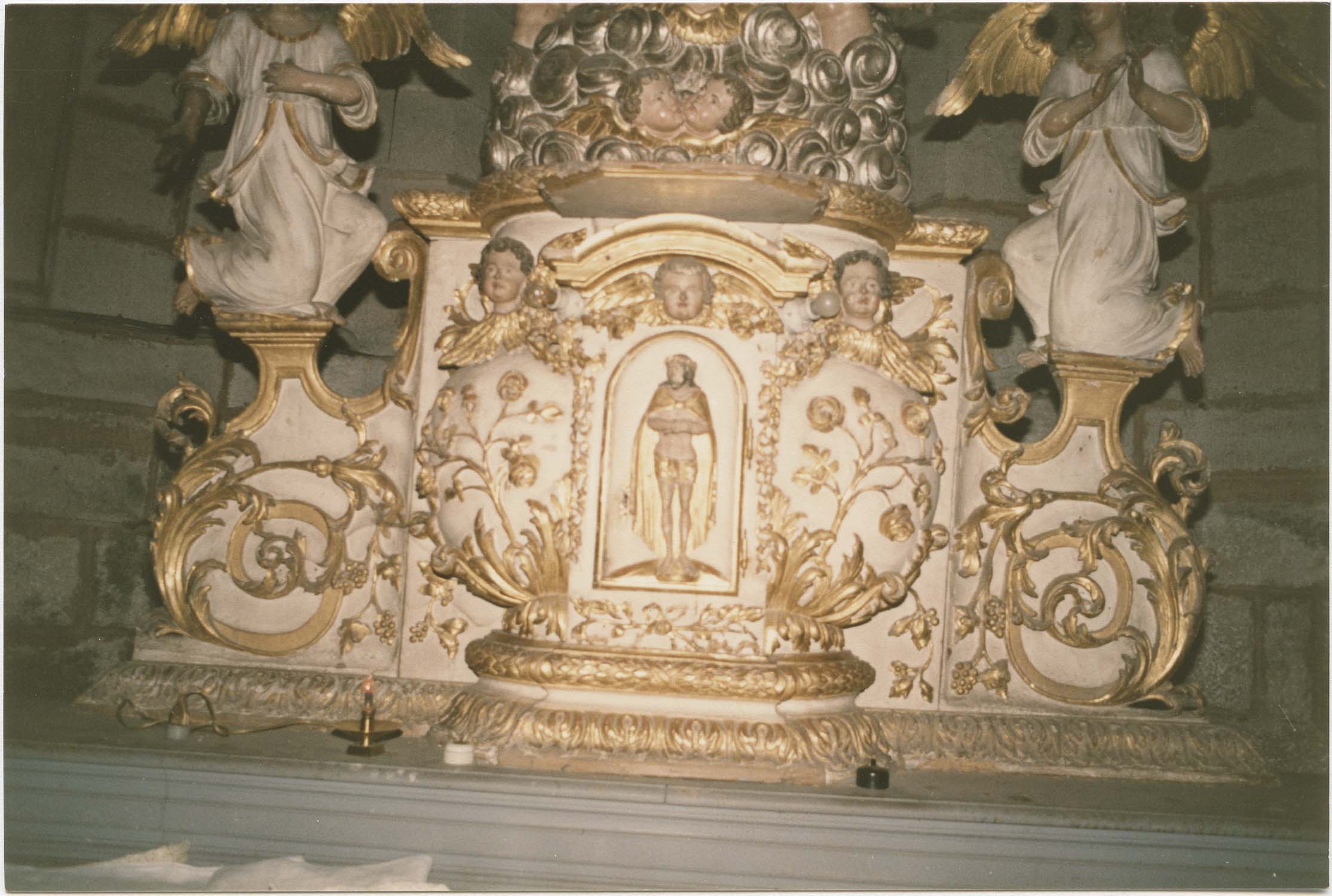 Autel rectangulaire surmonté d'un gradin ; la façade comporte un important regard vitré dont les angles supérieurs sont rentrants, encadré par une large moulure rapportée ; des portes ménagées au revers révèlent des espaces de rangement ; les parois intérieures de l'autel sont recouvertes de tissu