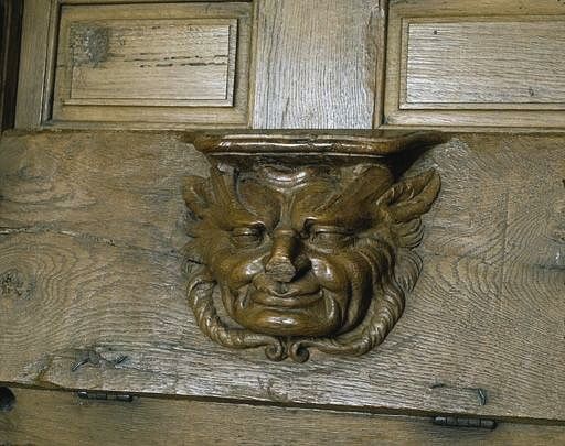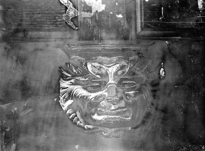 ornementation (enroulement, feuille d'acanthe) ; personnage (tête) ; masque