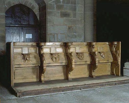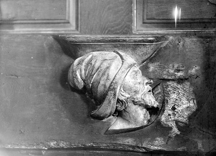 De gauche à droite, les miséricordes représentent : une tête de jeune homme à longue chevelure bouclée tournée vers la droite, un masque à grandes oreilles poilues et pointues avec une touffe de poils entre les sourcils, un masque grimaçant aux oreilles pointues avec deux tresses réunies sous le menton, une tête d'homme barbu coiffé d'un turban et regardant à droite ; les montants sont sculptés d'enroulements, de feuilles d'acanthe, de têtes en ronde-bosse (jeune homme, homme voile) prolongées par des ailes ; l'un des montants comporte au sommet un enroulement orné d'un entrelacs.