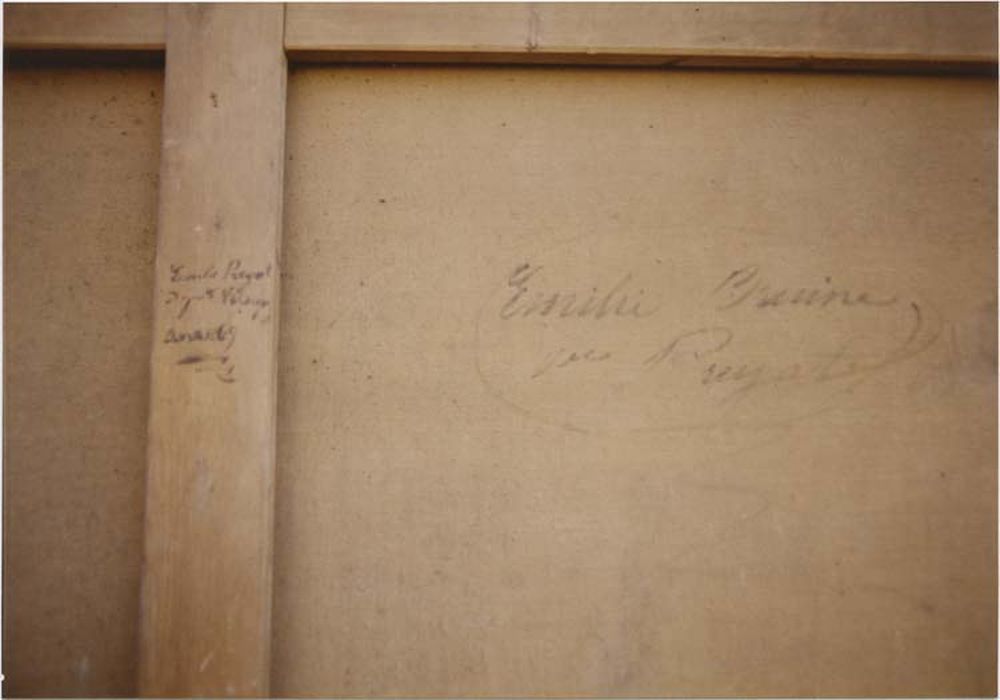 inscription peinte sur le titulus en trois lignes (hébreu, grec et latin) ; toile signée et datée : EMILIE BRUINE 1869 ; inscription au dos du châssis : 1869, EMILIE BRUINE VEUVE PRUYATE D'APRES VELASQUEZ