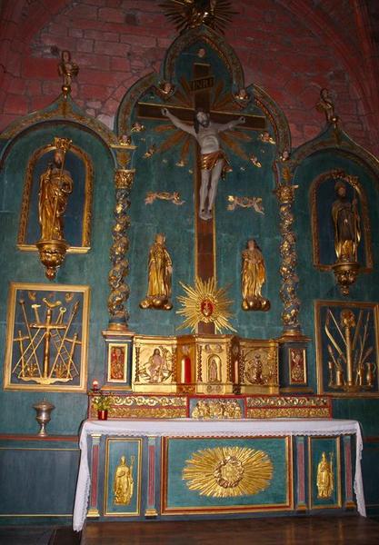 La façade de l'autel est divisée en trois parties par quatre pilastres cannelés à chapiteaux doriques ; les parties latérales comportent un panneau mouluré au centre duquel est rapportée la figure d'un évêque (saint Nicolas, ?) tenant la crosse dans la main gauche et un livre surmonté de trois bourses ou pierres dans l'autre, un enfant nu est représenté sur le panneau de gauche aux pieds du saint ; les panneaux sont surmontés d'un noeud doré ; la partie centrale est occupée par le symbole christique au centre d'une nuée rayonnante ; le fond de la façade est peint en bleu.
