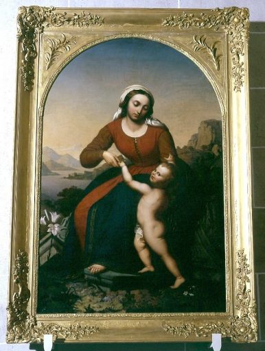 La Vierge est assise, un voile noué dans les cheveux ; elle tient la main droite de l'Enfant qui est debout et dénudé ; une tige de lys fleurie et un élément d'entablement complètent la scène sur la gauche ; le fond est constitué par un paysage lacustre ; le cadre mouluré est décoré dans ses angles de cartouches entourés de rinceaux fleuris.
