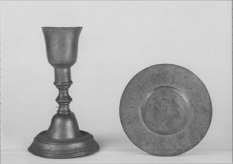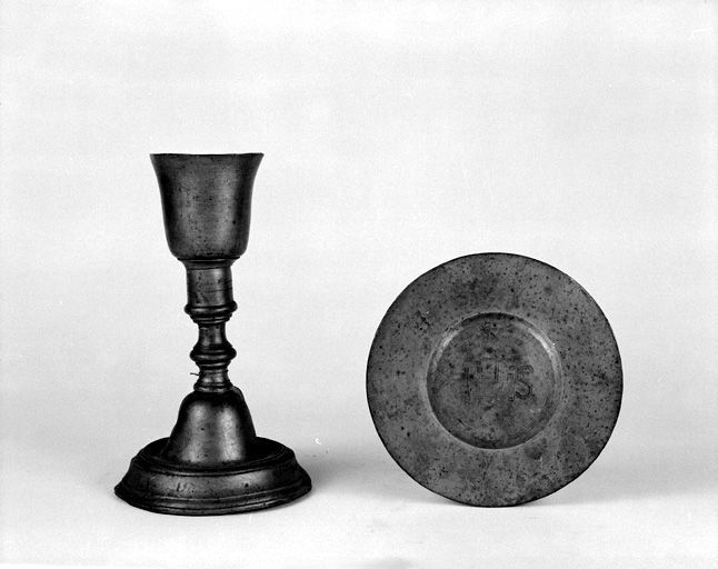 Calice et patène en étain caractéristiques de la période révolutionnaire.
