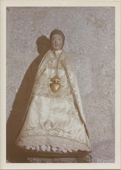 Il manque la partie inférieure de la statue, la partie supérieure subsistante présente d'importantes vermoulures. La statue a été fixée au début du 20e siècle sur un socle en bois, revêtue de deux robes de baptême superposées et coiffée d'une couronne en métal doré et verroterie.