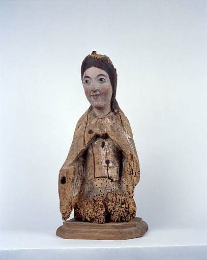 Vierge en majesté assise dont il ne subsiste plus que le visage et le buste ; cheveux peints en marron, carnation sur le visage, les pupilles des yeux et les sourcils sont soulignés à la peinture noire. Les pans du manteau ouvert sur le devant devaient reposer sur les avant-bras.