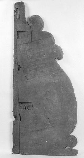 Fronton assemblé au niveau de la partie antérieure de la face. Dieu le Père et la Vierge en haut relief, décor des ailerons en bas relief.