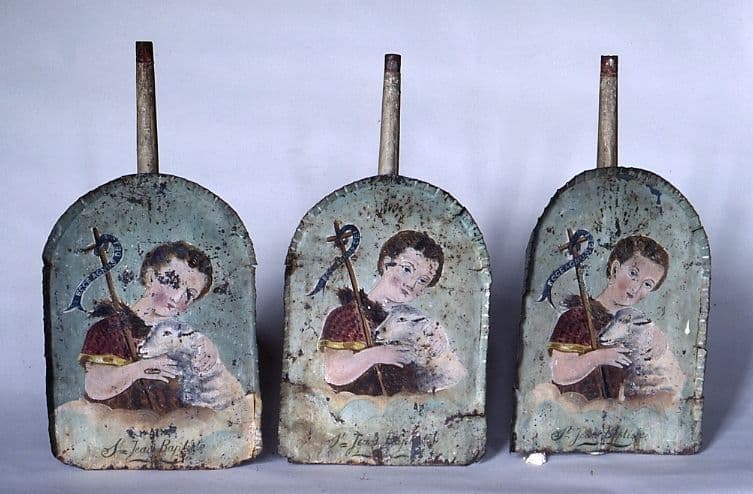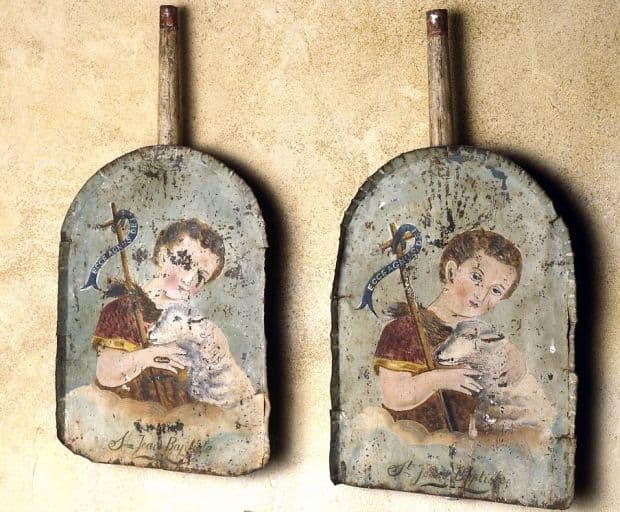 2 panonceaux de cierge de la confrérie des pénitents blancs : saint Jean-Baptiste enfant