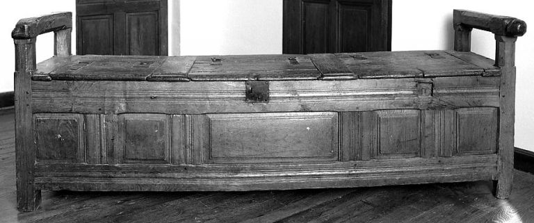 Il s'agit d'un meuble traditionnel combinant les fonctions de banc et de coffre à sel, du 17e siècle. Oeuvre d'artisanat local, mentionnée dans l'inventaire de 1790 dans la cuisine.