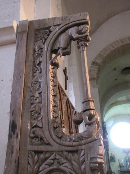 Les jouées des stalles hautes côté nef sont ornées de 3 scènes de la vie de la Vierge : à droite, encadrée par un motif architectural reprenant le dessin d'une baie composée à 2 lancettes, l'Annonciation et à gauche, dans 2 quadrilobes superposés, la Visitation et la Nativité. Les dossiers des stalles hautes ont été laissés nus mais sont décorés d'arcatures trilobées. Les jouées des stalles basses sont sculptées aussi bien côté nef que côté choeur de scènes empruntées à la vie de saint Jean l'Evangéliste, patron de l'église : sous des arcatures reprenant le dessin d'une baie composée à 2 lancettes, la Cène et le martyre du saint (côté nef) puis la préparation suivie de la dégustation de la coupe empoisonnée et la mort d'un personnage tonsuré (côté choeur). Les dessus de chaque jouée ainsi que les miséricordes sont décorées par des petites figures caricaturales