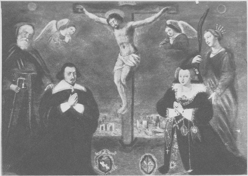 tableau : Christ en croix entre Antoine Rousseau, Barbe Deslandes et leurs saints patrons
