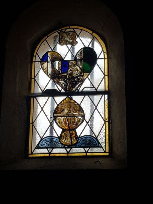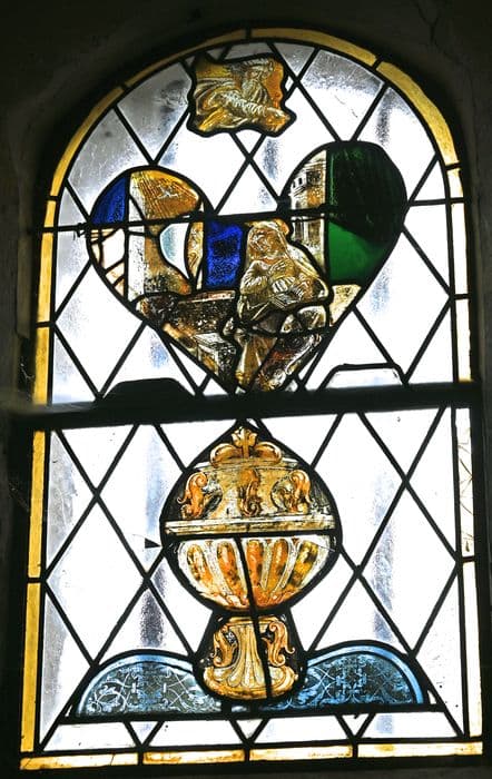 verre transparent (coloré) : grisaille sur verre, jaune d'argent ; plomb (réseau)