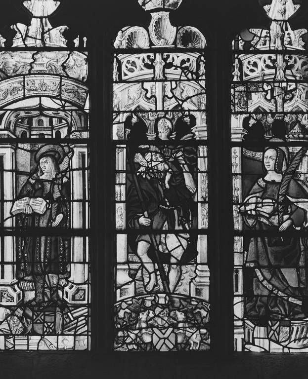verre transparent (coloré) : grisaille sur verre, jaune d'argent, gravé ; plomb (réseau)