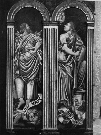 au revers des panneaux : les évangélistes et leur symbole sous arcatures (à gauche : saint Matthieu et saint Luc, à droite : saint Marc et saint Jean)