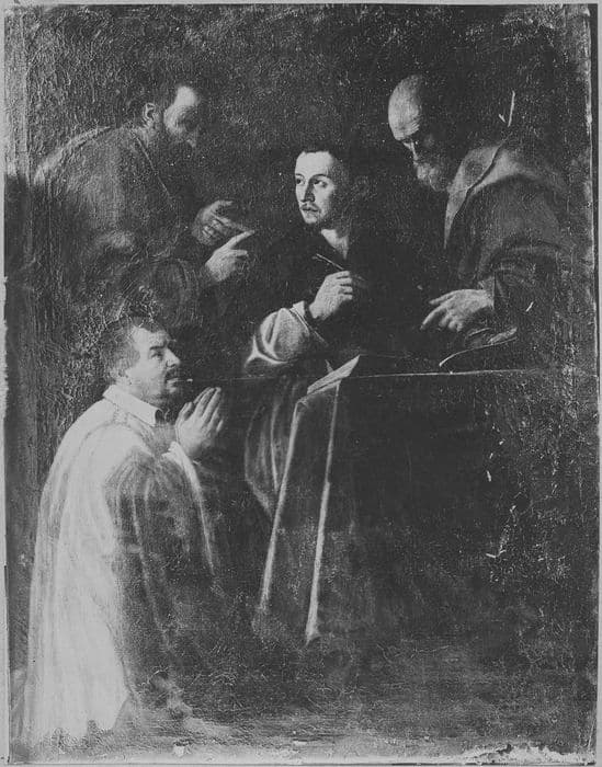 tableau : saint Thomas écrivant sous la dictée de saint Pierre et saint Paul