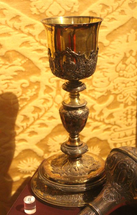 calice du 2e quart du 18e siècle, oeuvre de l'orfèvre parisien Guillaume Jacob, actif de 1714 à 1753 ; la coupe a été refaite pendant la 1ère moitié du 19e siècle par un orfèvre non identifié ; objet déposé au musée d'art sacré de Dijon depuis 1980