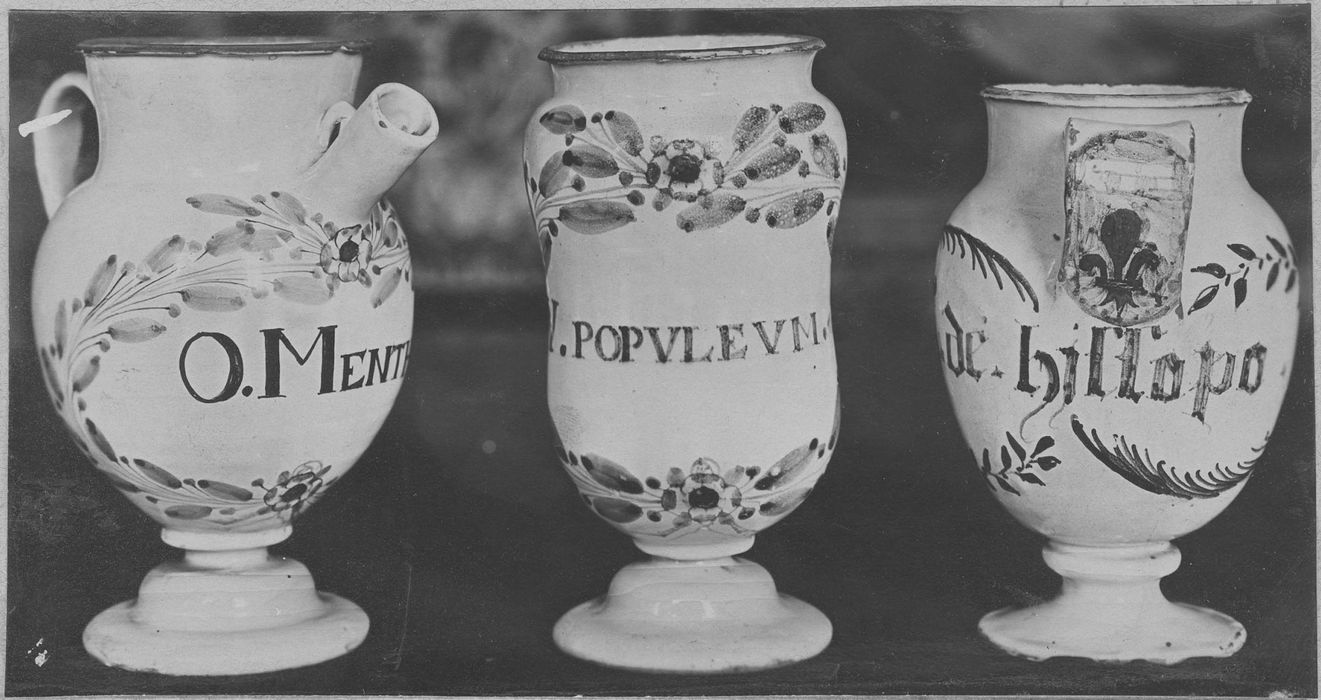 Provenant de l'hospice Sainte-Anne, cet ensemble de pots canons se trouvait à l'hôpital général depuis 1958. Le pot MVB D.85.5.5, appelé albarello, et les pots MVB D.85.5.59 et 60, aux inscriptions V. ROSATVM et BENEDICTALAXAT, se trouvaient dans le bureau du receveur de l'hôpital général.