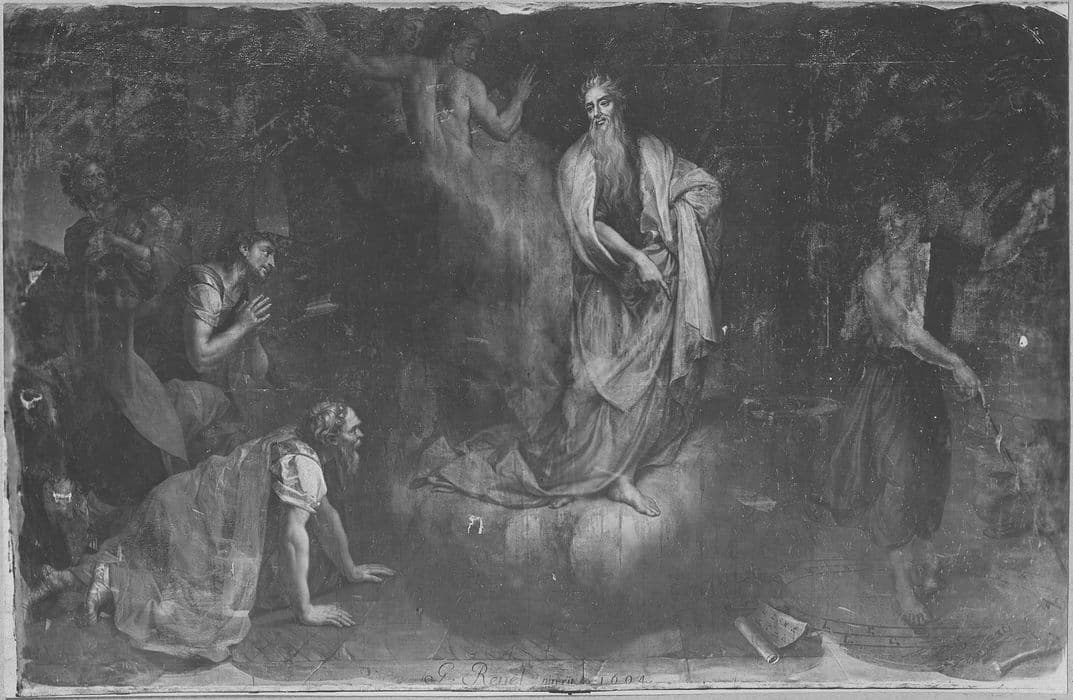 scène biblique (Saül : prosterné, Samuel, Pythonisse d'Endor : feu, fumée)