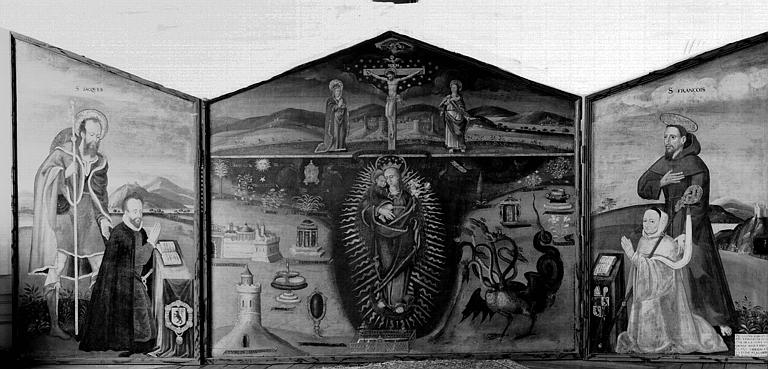 Crucifixion ; homme : Beugre Jacques de : en donateur, saint Jacques le Majeur ; homme : Beugre François de : en donateur, saint François d'Assise ; sainte Marguerite ; saint Jean l'Evangéliste