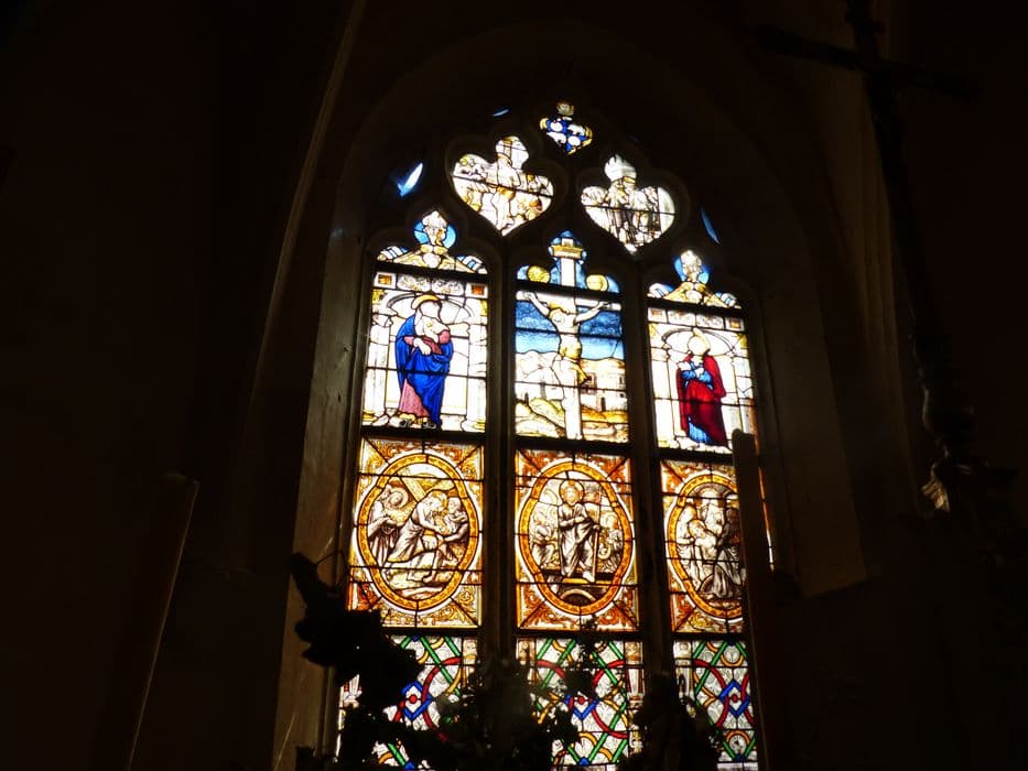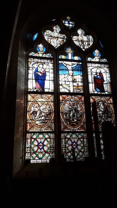 verre transparent (coloré) : grisaille sur verre, jaune d'argent ; plomb (réseau)