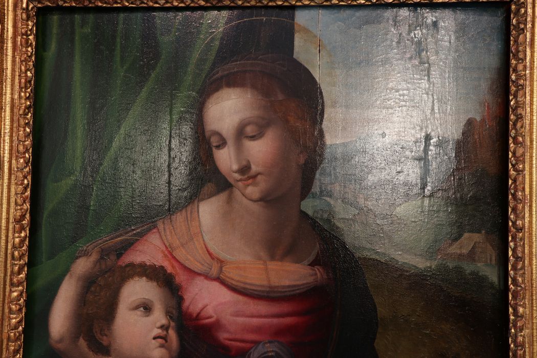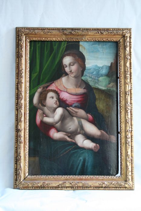 Oeuvre du 16e siècle, cadre du 18e siècle ; ce tableau est une variante de la madone Bridgewater (National Gallery of Scotland, Edimbourg) peinte par Raphaël en 1506-1507 ; mais aucun paysage ne figure sur l'oeuvre de Raphaël, bien qu'une baie en plein cintre encadrant un paysage ait été révélée par rayons X ; par contre l'auteur du tableau de Nolay y a représenté un paysage de facture flamande ; une autre variante est conservée à l'église de Drée (21), probablement l'oeuvre du même artiste flamand ; un tableau identique est conservé à Messigny (21), mais en mauvais état (source : notice IM21001995).