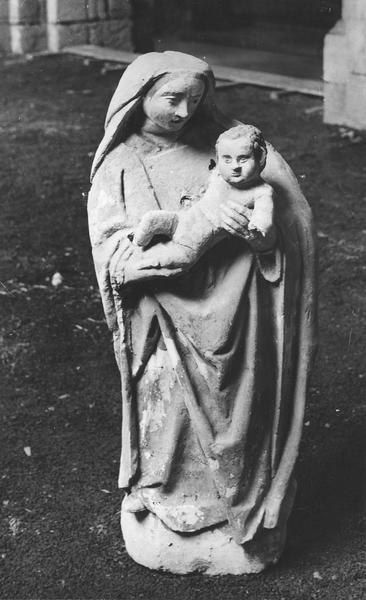 Vierge à l'enfant debout, regardant l'enfant et le soutenant à deux mains, son large manteau retombabt sur l'épaule gauche. Mains de la Vierge démesurées.
