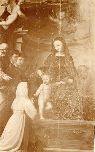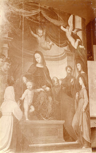 scène (Vierge à l'Enfant, sainte Catherine d'Alexandrie : symbole : mariage religieux, saint Pierre, saint Vincent, saint Etienne, saint Dominique, saint François, saint Barthélémy, saint Laurent)