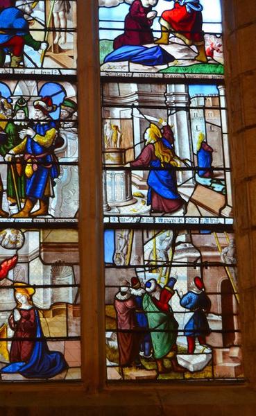 verre transparent (coloré) : grisaille sur verre, jaune d'argent ; plomb (réseau)