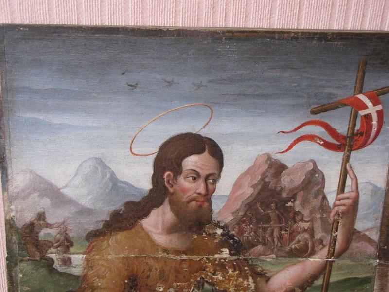 Oeuvre restaurée en 2013 par Martine Lemot. Les baguettes actuelles ne sont pas originales mais remplacent vraisemblablement des moulures plus anciennes car il n'y a pas de peinture sous les baguettes séparant les scènes. D'anciennes appliques décoratives étaient placées de part et d'autre de la devise sur le socle, de part et d'autre et au centre de l'architrave.