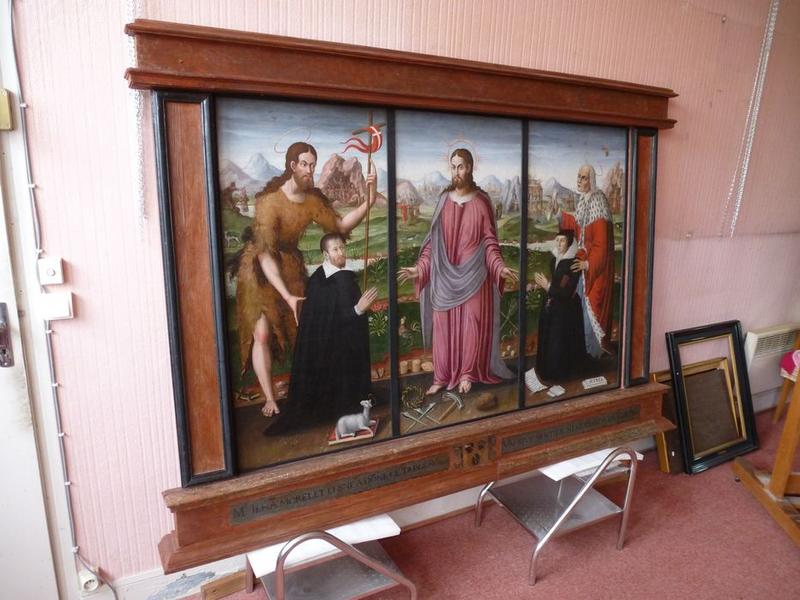 Face du tableau divisée en 3 scènes verticales séparées par des baguettes modernes en demi-ronds. Les scènes représentent respectivement de gauche à droite : saint-Jean et le donateur, le Christ, saint-Yves et la donatrice.