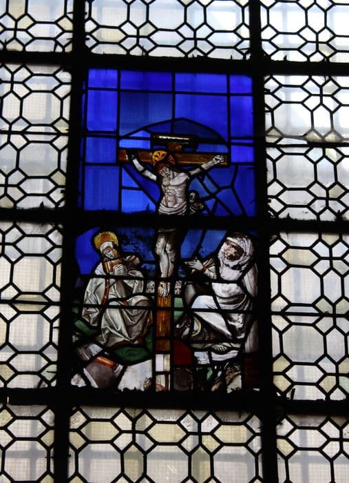 verre transparent (coloré) : grisaille sur verre, jaune d'argent ; plomb (réseau)