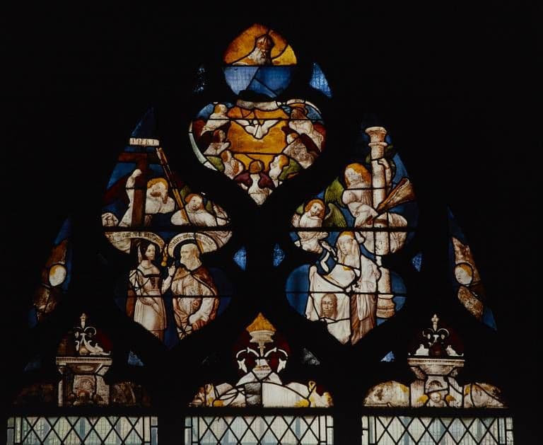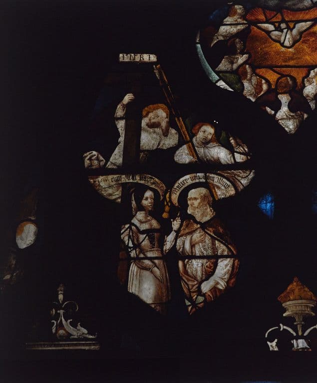verre transparent (coloré) : grisaille sur verre, jaune d'argent ; plomb (réseau)