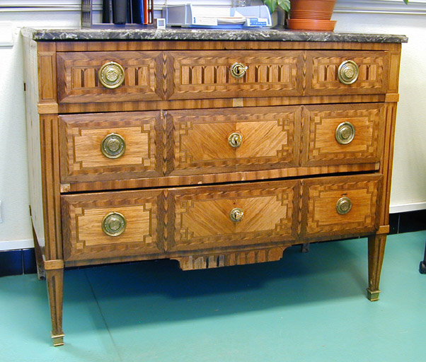 Commode d'époque Louis XVI réalisée par le menuisier-ébéniste Jean-Baptiste Courte reçu maître à Dijon en 1777. Les commodes n° 5 et 7 sont à rapprocher de celle-ci.