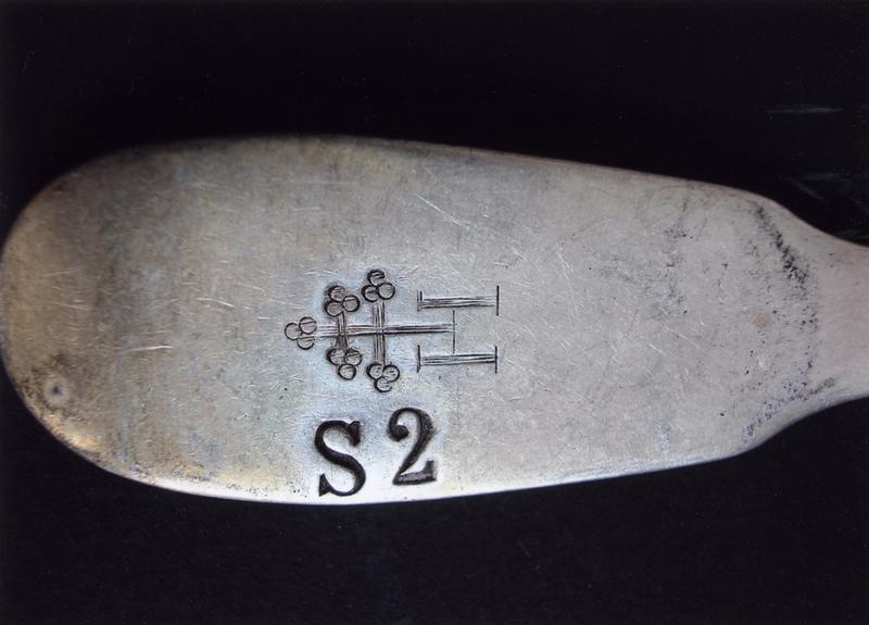 Poinçon de maître : écu couronné portant en chef les armes de la ville de Dijon, en pointe la lettre D ; communauté de Dijon, 1781-1782 : lettre F couronnée ; charge de Dijon, 1768-1781 : lettre P fleuronnée et couronnée. Marque de l'hôpital du Saint-Esprit gravée sur la spatule : lettre H surmontée d'une croix à double traverse. Inscription poinçonnée : S 2.